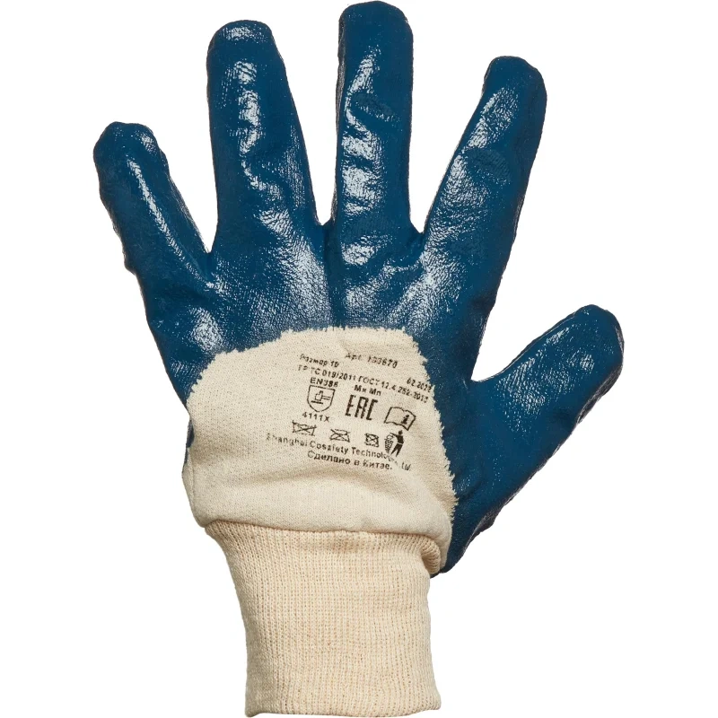 Перчатки защитные безразмерные 1 пара, белый/синий, х/б, неполное нитриловое покрытие, манжет-резинка