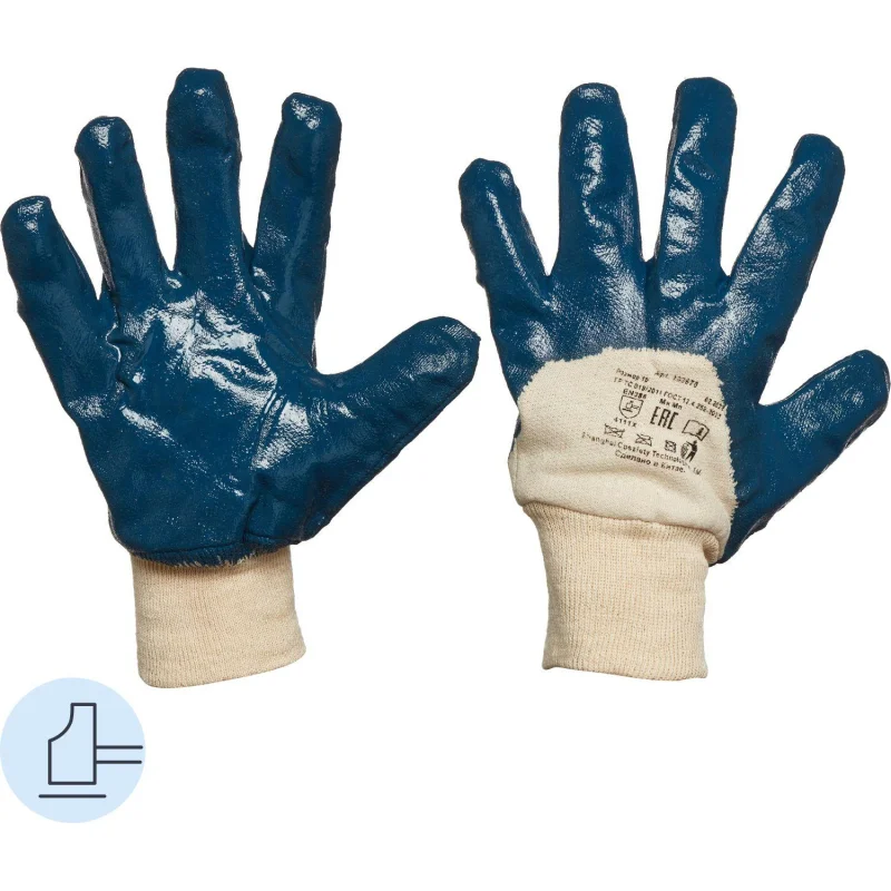 Перчатки выполнены из трикотажа и имеют неполный двойной нитриловый облив, что обеспечивает дополнительную защиту. Нитриловое покрытие отталкивает продукты нефтепереработки, смазочные материалы и грязь. Анатомическая форма перчаток и их покрытие обеспечивают надежный захват на сухих и промасленных поверхностях.