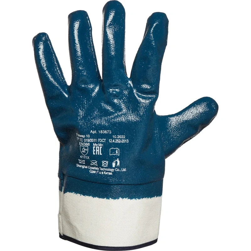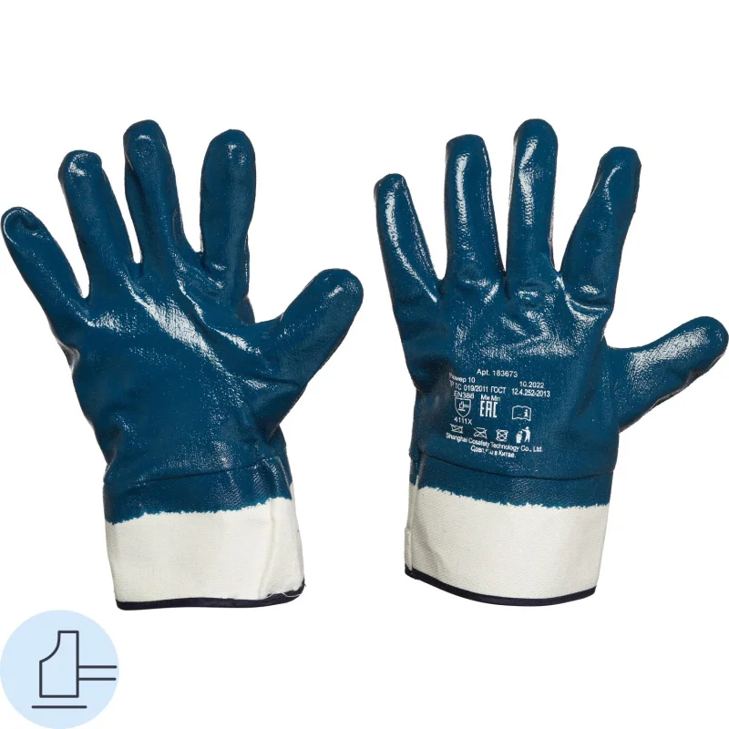 Перчатки защитные безразмерные 1 пара, белый/синий, х/б, полное нитриловое покрытие, манжет-крага