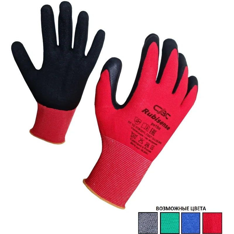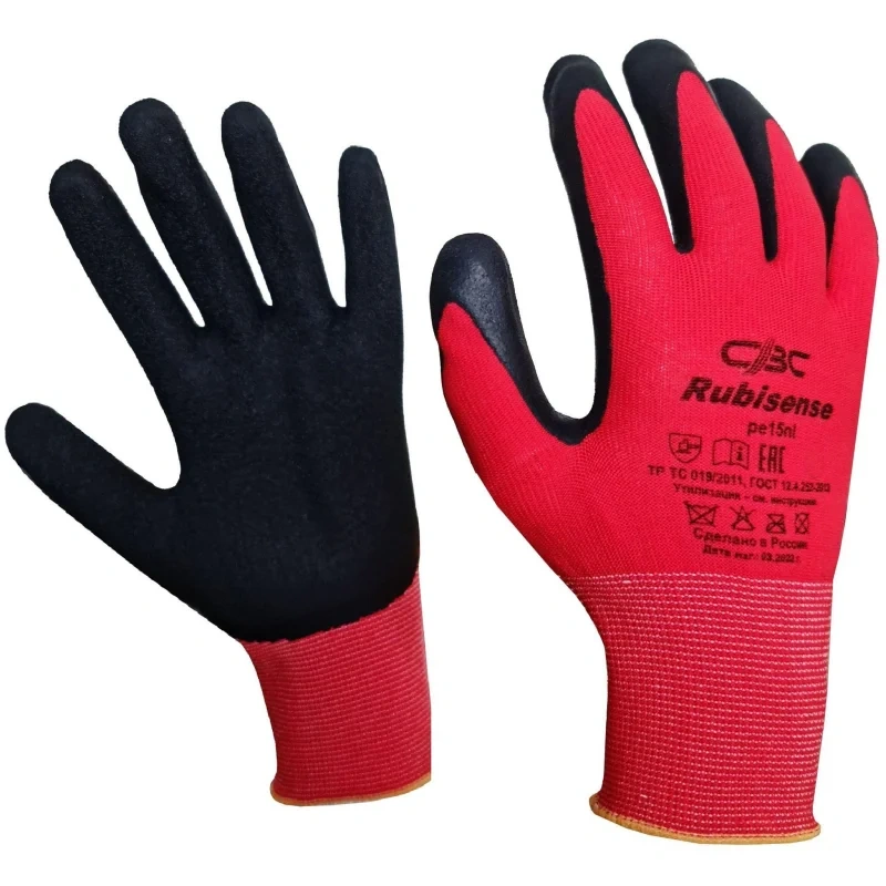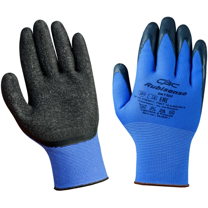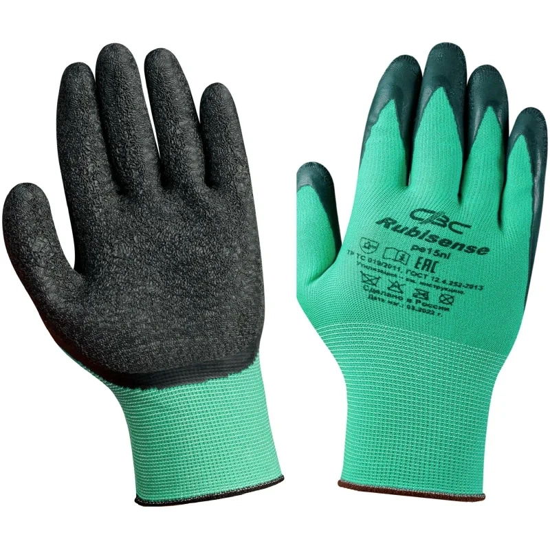 Перчатки рабочие защитные СВС Rubisense полиэфирные с рельефным латексным покрытием (15 класс, размер 8, M) pe15nl. Полиэфирные рабочие перчатки с рельефным латексным покрытием предназначены для защиты от порезов и повреждений пальцев при работе с острыми и колющими предметами. Обеспечивают хорошее сцепление с сухими, влажными и скользкими поверхностями. Перчатки обладают высокой механической прочностью, что делает их идеальными для использования в строительстве и садоводстве.