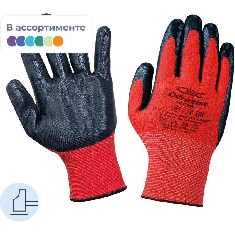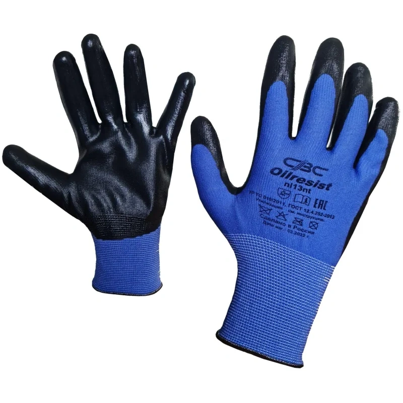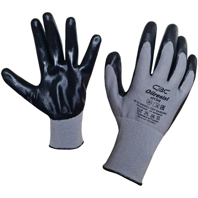 Перчатки рабочие защитные СВС Oilresist полиэфирные с нитрильным покрытием (15 класс, размер 10, XL) nl13nt. Универсальные рабочие перчатки предназначены для защиты от мелких механических повреждений и общих производственных загрязнений. Трикотажные полиэфирные перчатки с нитриловым покрытием оптимальны для работ с замасленными деталями, обеспечивая надежное сцепление. Нитриловый слой на ладони гарантирует максимальную чувствительность пальцев.