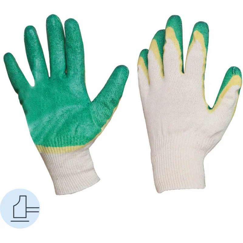 Перчатки рабочие защитные трикотажные с двойным латексным покрытием белые/зеленые (13 класс, универсальный размер, 200 пар в упаковке). Универсальные рабочие перчатки трикотажные х/б с двойным латексным покрытием ладони и вязаной манжетой предназначены для защиты рук от механических повреждений в производственных и бытовых условиях. Латексное покрытие обеспечивает надежный захват скользящих материалов, повышая безопасность при выполнении различных работ.