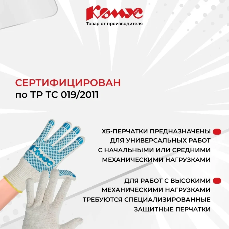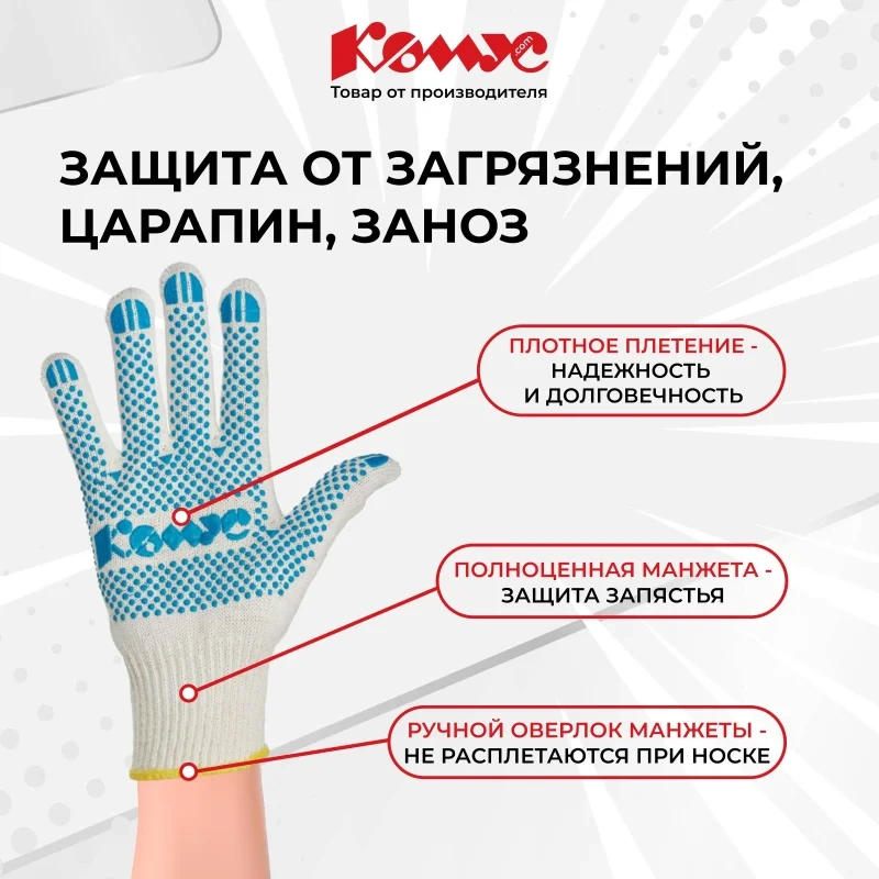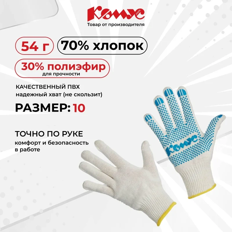 Перчатки рабочие защитные Комус трикотажные с ПВХ покрытием белые (5 нитей, 10 класс, размер 10, XL, 5 пар в упаковке). Универсальные рабочие перчатки х/б с покрытием ПВХ предназначены для защиты рук от мелких механических повреждений и производственных загрязнений. Размер 10. Перчатки применяются в складских, садовых и ремонтных работах.Перчатки изготовлены из хлопчатобумажной пряжи с покрытием из поливинилхлорида, нанесенным на внутреннюю сторону. Покрытие ПВХ обеспечивает плотный захват и предотвращает соскальзывание деталей. Трикотажные перчатки с манжетой на резинке обеспечивают плотное прилегание к руке.Материалы: 70% хлопок, 30% полиэфир. Вес пряжи - 116,8 текс. Покрытие: ПВХ, точка. Соответствуют ТР ТС 019/2011. Количество пар в упаковке: 5. Количество упаковок в транспортной коробке: 40.Цвет на изображении товара в интернет-магазине или в печатном каталоге может отличаться от оригинала из-за особенностей цветопередачи монитора.ЗАКОНОДАТЕЛЬНЫЕ И ТЕХНИЧЕСКИЕ ДОКУМЕНТЫ: