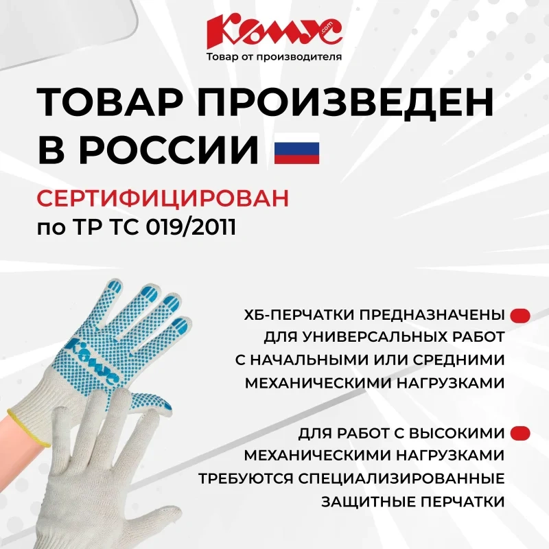 Перчатки рабочие защитные Комус трикотажные с ПВХ покрытием белые (5 нитей, 10 класс, размер 8, М, 5 пар в упаковке). Универсальные рабочие перчатки х/б с покрытием ПВХ предназначены для защиты рук от мелких механических повреждений и загрязнений в процессе работы. Размер 8. Применяются в складских, садовых и ремонтных работах.Перчатки изготовлены из хлопчатобумажной пряжи с покрытием ПВХ, нанесенным на внутреннюю сторону. Покрытие ПВХ обеспечивает плотный захват и предотвращает соскальзывание деталей. Трикотажные перчатки с манжетой на резинке плотно прилегают к руке, что повышает комфорт и защиту.Основные материалы: 60% хлопок, 40% полиэфир. Вес пряжи - 116,8 текс. Покрытие: ПВХ, точка. Соответствуют стандартам ТР ТС 019/2011, ГОСТ 12.4.252-2013, ГОСТ 12.4.183-91. Количество пар в упаковке: 5. Количество упаковок в транспортной коробке: 40. Цвет на изображении товара в интернет-магазине или в печатном каталоге может отличаться от оригинала из-за особенностей цветопередачи монитора.ЗАКОНОДАТЕЛЬНЫЕ И ТЕХНИЧЕСКИЕ ДОКУМЕНТЫ: