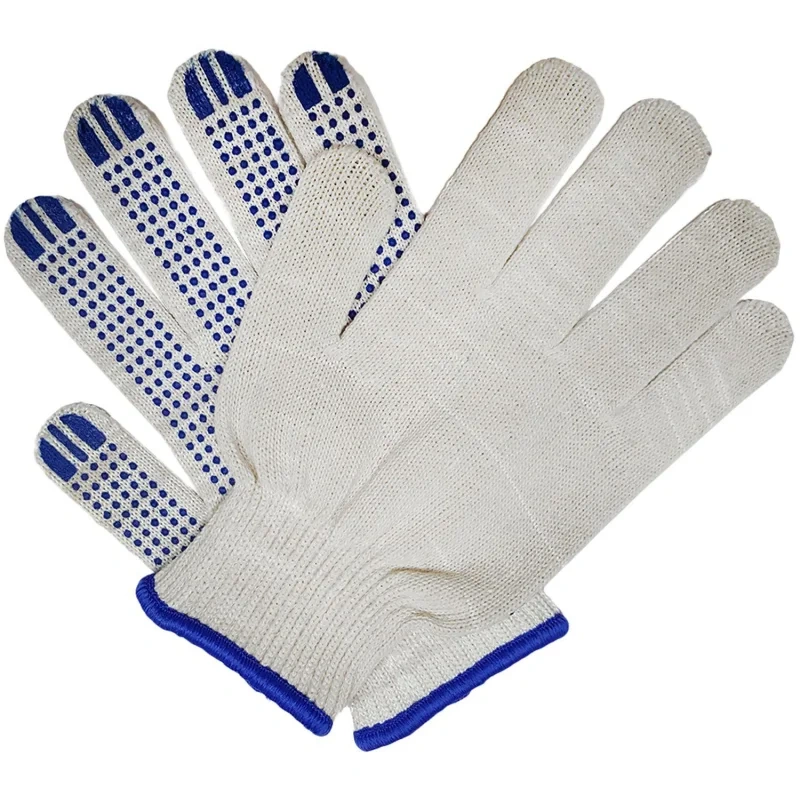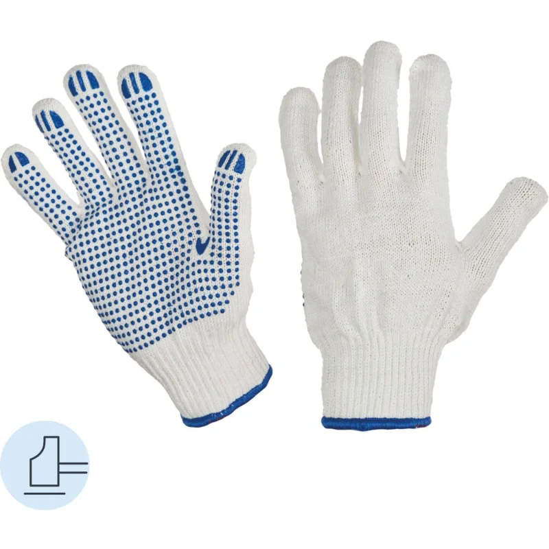 Перчатки изготовлены из хлопчатобумажной пряжи (60% хлопок, 40% полиэфир) с покрытием из ПВХ с точечным рисунком на тыльной части. Покрытие ПВХ обеспечивает плотный захват и предотвращает соскальзывание деталей, что повышает комфорт при работе с инструментами.