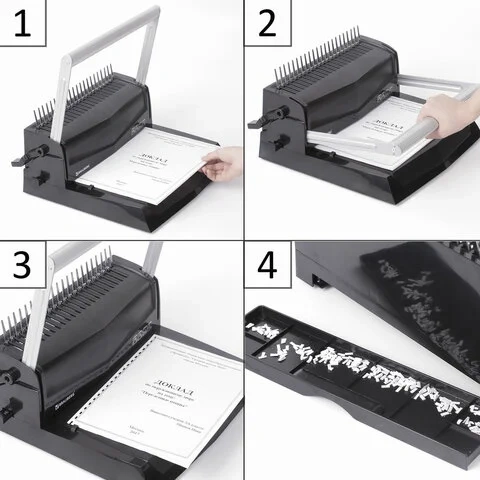 Пробивает и переплетает листы формата А3 по короткой стороне, А4, А5, А6, А7 и ниже - по длинной стороне.