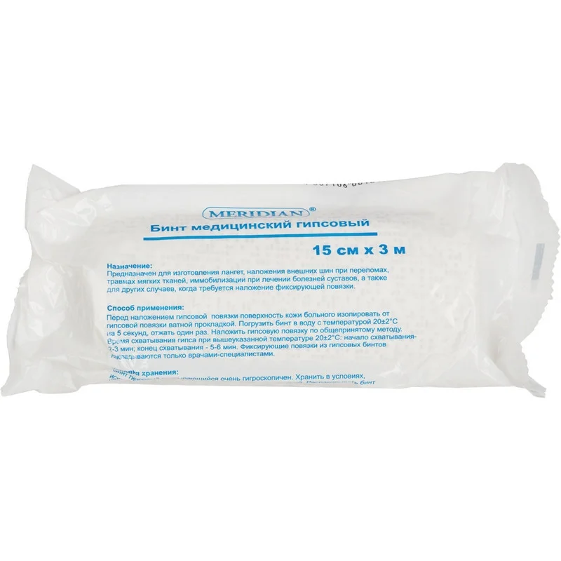 Бинт медицинский гипсовый Меридиан. Хлопковые марлевые повязки пропитывают сухим сульфатом кальция и клеевым составом. Повязки представляют собой единый рулон марлевой выбеленной ткани, без стыков и разрывов. Изготовлен из высококачественных сортов гипса, что исключает аллергические реакции кожи; хорошо пропускают рентгеновское излучение, позволяя получать снимки высокого качества. Предназначен для изготовления лангет, наложения внешних шин при переломах, травмах мягких тканей, иммобилизации при лечении болезней суставов и т.д. Время начала схватывания: 2-3 минуты. Конец схватывания: 5-6 минут. Размерный ряд: 10 см х 3 м, 15 см х 3 м, 20 см х 3 м. Упаковка: полиэтилен. Срок хранения: 3 года с даты выпуска.