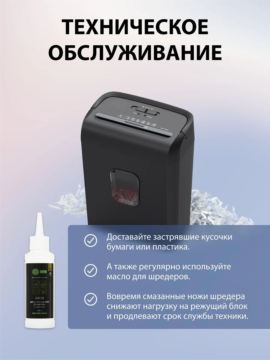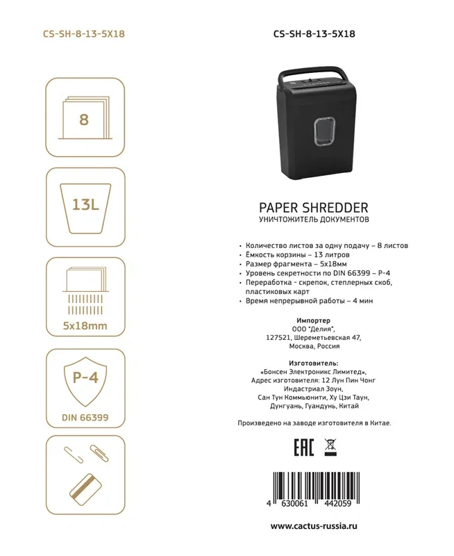 Персональный шредер Cactus CS-SH-8-13-5X18, 8 листов, 13 литров, 4 уровень секретности
