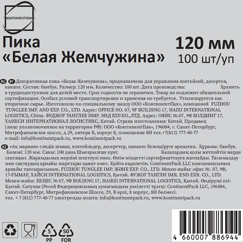 Пика Континентпак Белая жемчужина бамбуковая 12см, 100шт