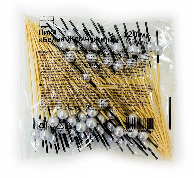 Декоративная пика Белая Жемчужина предназначена для украшения коктейлей, десертов, канапе. Такая одноразовая шпажка используется для украшения блюда и удобна при подаче еды на стол. Очень популярный барный аксессуар для организации фуршетов, банкетов и праздничных столов, который придаёт сервировке праздничное настроение. Пики изготовлены из натурального бамбука и заострены с одной стороны. Круглый пластиковый держатель в виде крупной жемчужины окрашенной в белый цвет. Пику для канапе Жемчужина белая очень удобно держать в руке. А после применения набор для канапе легко утилизируется, как обычный бытовой мусор.