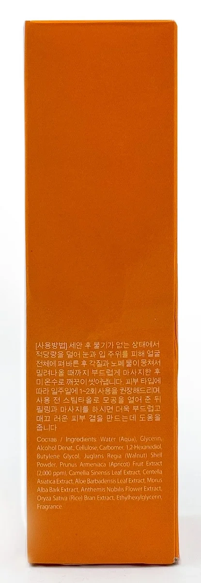 Мелкие частицы целлюлозы в сочетании с пудрой из скорлупы грецкого ореха мягко удаляют ороговевшие клетки и очищают поры, делая кожу гладкой и сияющей. Абрикос регулирует работу сальных желез, выравнивает тон кожи, смягчает и питает. Центелла азиатская увлажняет кожу, ускоряет регенерацию клеток, снимает покраснения.