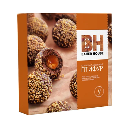 Карамельно-арахисовый Птифур - мини-пирожное на основе шоколадного бисквита с густой карамельной начинкой и посыпкой арахисом. В упаковке 9 мини-пирожных.