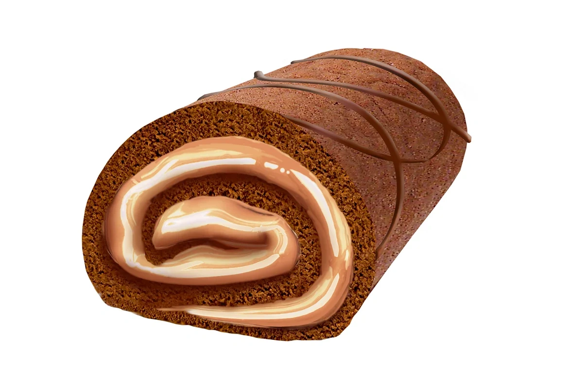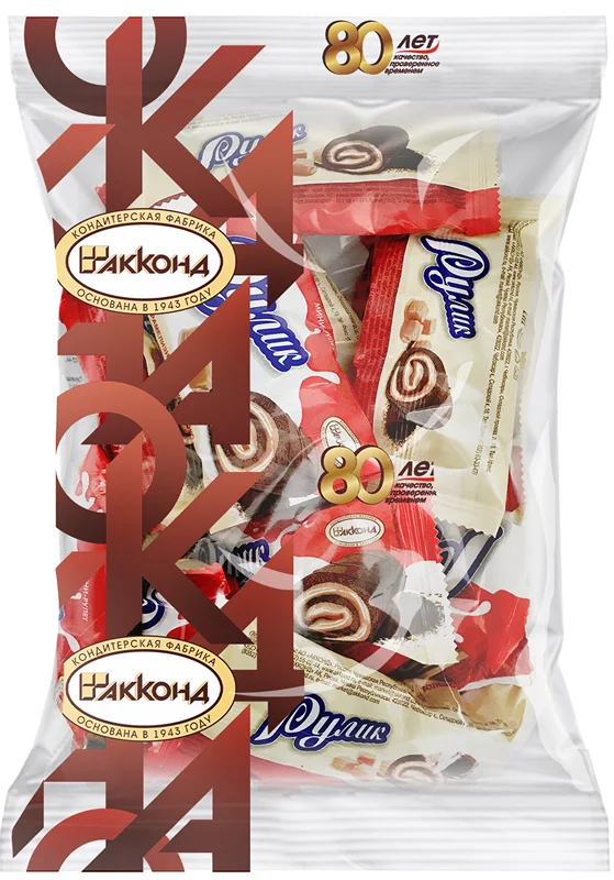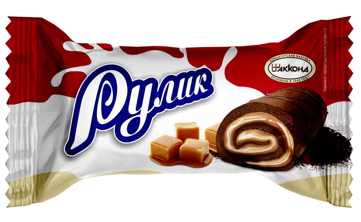 Мини-рулет из тёмного бисквита с аэрированной начинкой на основе цельного сгущённого молока.Для производства конфет используются ингредиенты высочайшего качества.