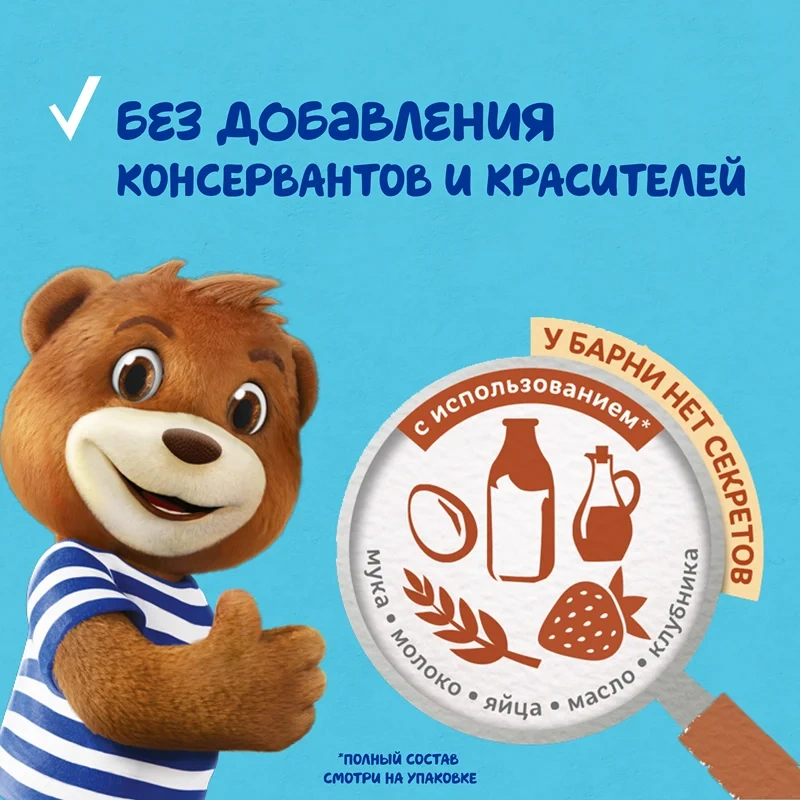 Бисквитное пирожное Барни с клубничной начинкой - специально разработанное для детей кондитерское изделие в виде медвежонка, производится на основе натуральных ингредиентов: злаков и молочных продуктов. Обогащено кальцием, необходимым для здорового роста и развития детей, не содержит красителей и консервантов. Рекомендовано для детей дошкольного возраста от 3х лет. Медвежонок Барни - вкусный, полезный и питательный перекус, прекрасная альтернатива печенью, кексам или другой сладкой выпечке, отлично сочетается с соком, молоком, кефиром, йогуртом, чаем или какао, его удобно брать с собой в дорогу, давать ребенку в школу или на прогулку. Это отличный вариант сладкого угощения на детский праздник в детский сад, школу, на День рождения. В коробке пять пирожных в индивидуальных упаковках.