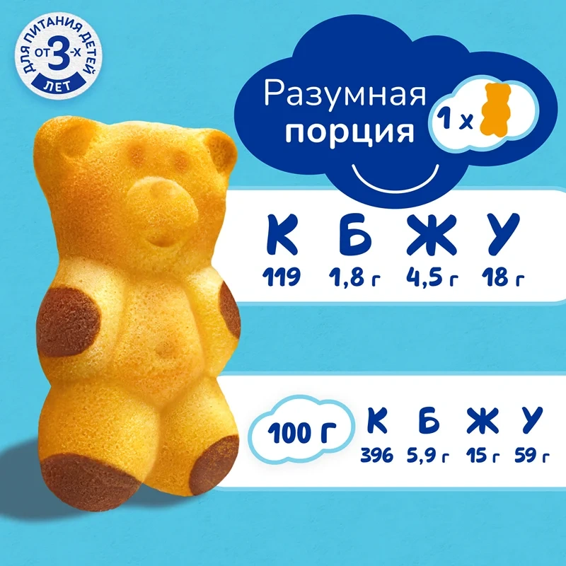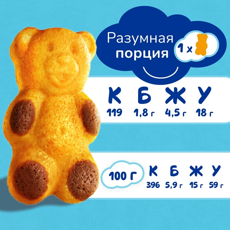 Это натуральное бисквитное пирожное в форме медвежонка с шоколадной начинкой. Набор бисквитных пирожных с шоколадной начинкой порадует тех, кто любит нежный ванильный бисквит и качественный молочный шоколад. Пирожные в виде медвежат радуют детей и взрослых не только своим интересным видом, но и приятным вкусом. Такой десерт отлично подходит под чашечку ароматного чая или стакан молока.