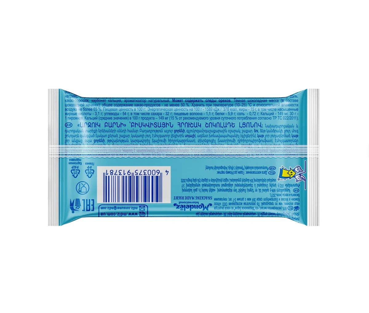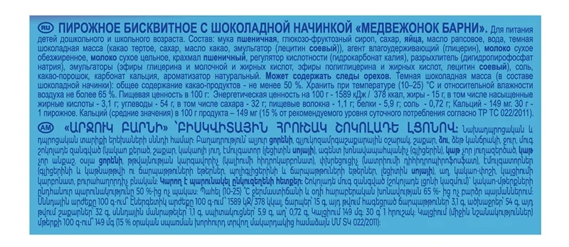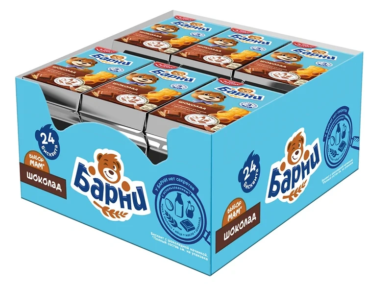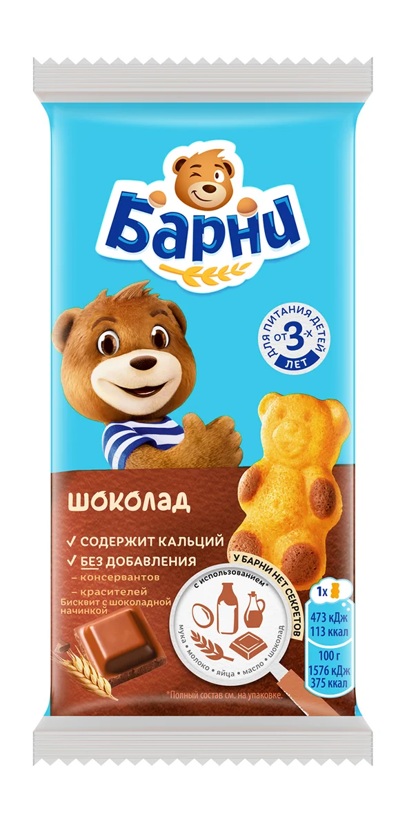 Бисквитное пирожное Барни с шоколадной начинкой - специально разработанное для детей кондитерское изделие в виде медвежонка, производится на основе натуральных ингредиентов: злаков и молочных продуктов. Обогащено кальцием, необходимым для здорового роста и развития детей, не содержит красителей и консервантов. Рекомендовано для детей дошкольного возраста от 3х лет.