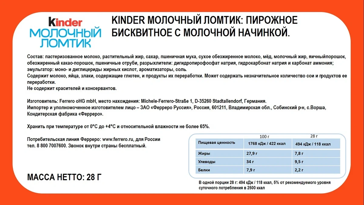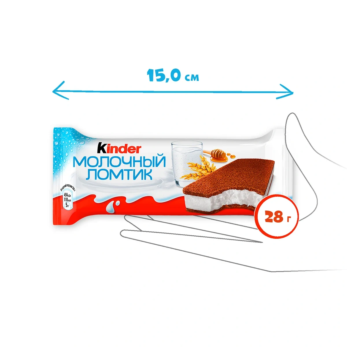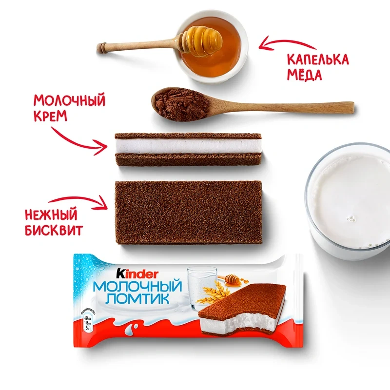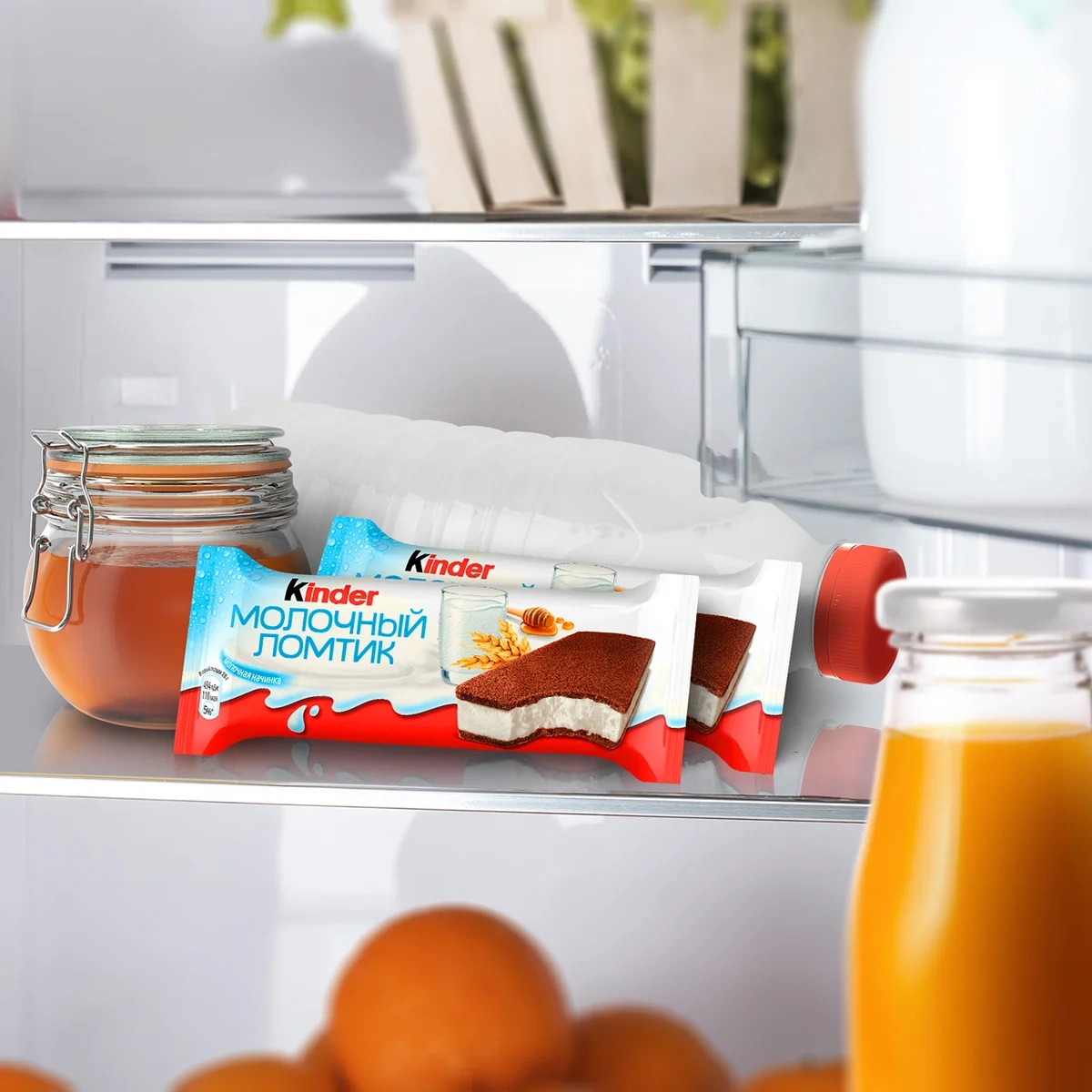 Kinder Молочный Ломтик – вкусный бисквит с молочной начинкой и добавлением меда, изготовленный по инновационным технологиям с высоким содержанием натурального молока (40%). Как все молочные продукты, Kinder Молочный Ломтик нужно хранить в холодильнике. Не содержит красителей и консервантов.