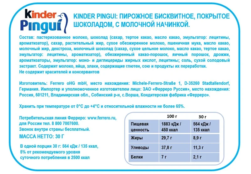 Сладкий десерт Kinder Pingui — сытный перекус для ребенка и взрослого. Это легкий продукт, состоящий из мягкого бисквита и молочной начинки. Сверху он покрыт горьковатым темным шоколадом, далее следует слой молочной начинки, после — снова шоколад и еще один слой из молока. По вкусу умеренно сладкий, медленно тает во рту и оставляет мягкое сливочное послевкусие. Он хорошо сочетается с молочными продуктами или чаем. Такое пирожное следует хранить охлажденным.
