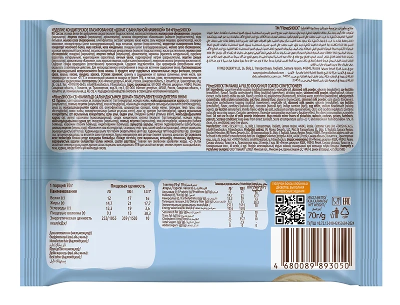 Смесь протеинов, сухое обезжиренное молоко, сывороточный протеин, миндальная мука, сухое цельное молоко, сухой яичный порошок, молочный шоколад без сахара, подсластитель мальтит, какао-масло, какао-тертое, эмульгатор соевый лецитин, экстракт ванили, кокосовое масло, вода, натуральный мед, какао-порошок, влагоудерживающая добавка глицерин.