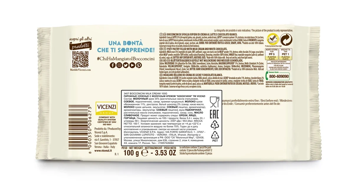 Пирожные Vicenzi Bocconcini слоеные с молочным кремом, 100г