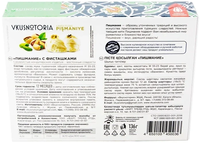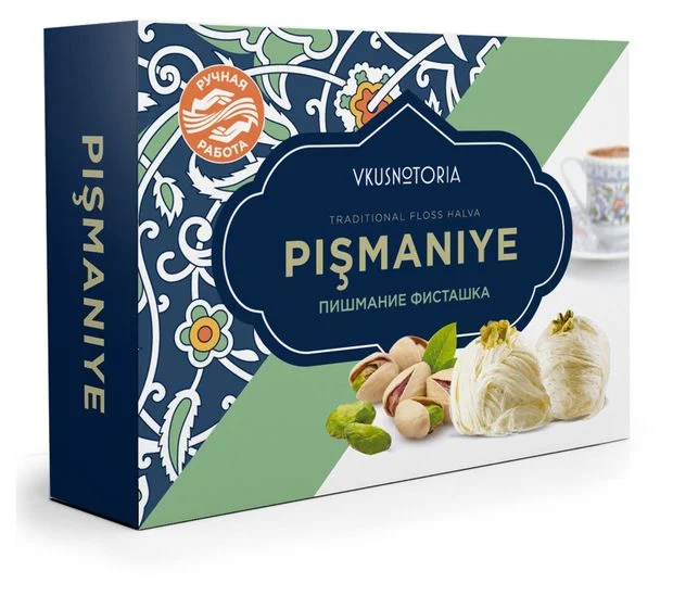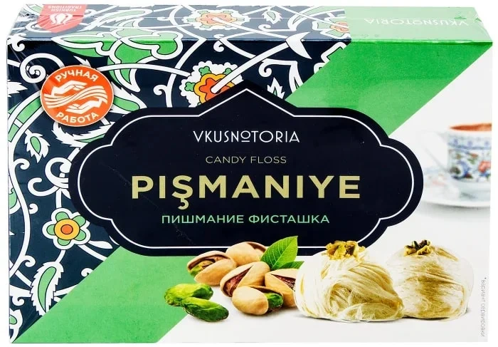 Пишмание Вкуснотория с фисташками, 136г — образец утонченных традиций и высокого искусства приготовления турецких сладостей. Нежные тающие нити Пишмание подарят Вам незабываемый мир романтики и блаженства вкуса! Пишмание — вкус, дарящий радость! Высокое кулинарное искусство в сочетании с современным оборудованием и ручной работой мастеров делают наш продукт уникальным.