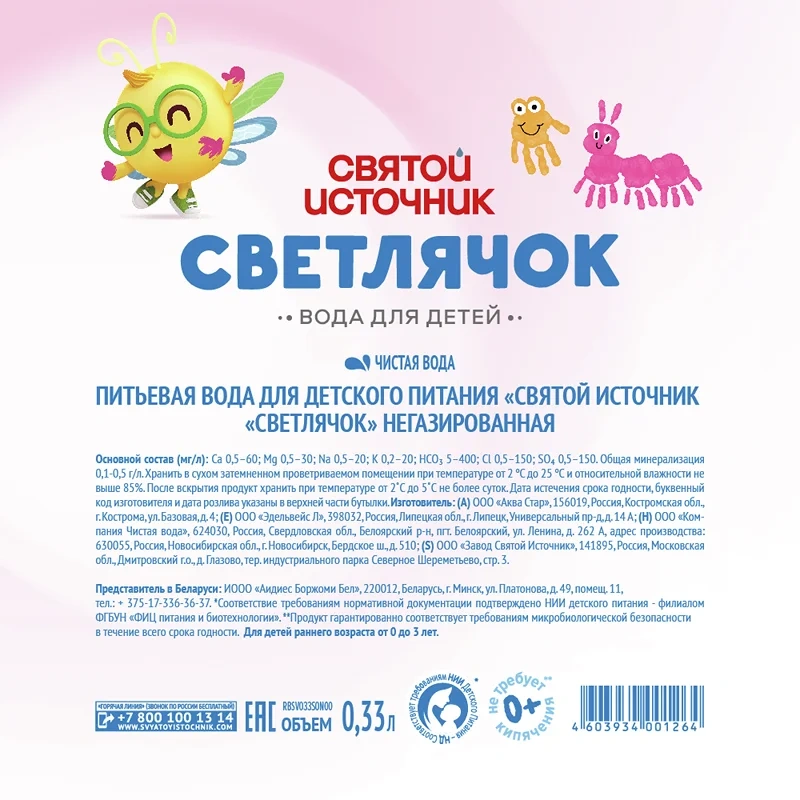 Вода детская Святой Источник Светлячок питьевая негазированная 0+, 330мл x 12 шт
