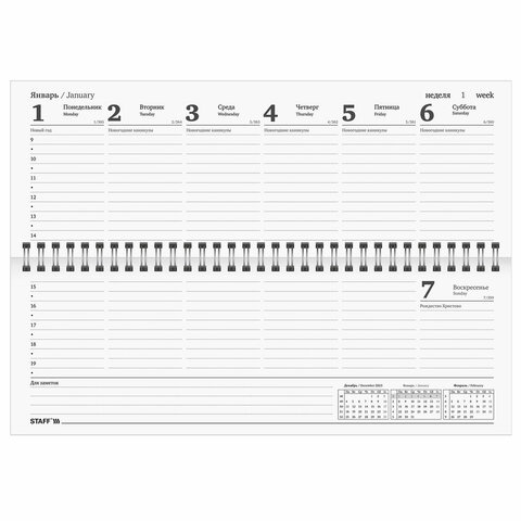 Внутренний блок содержит 64 листа офсетной бумаги белого цвета плотностью 65 г/м2. Обложка из мелованного картона обеспечивает долгий срок службы. Скрепление осуществляется с помощью евроспирали. Размер изделия - 285х112 мм.