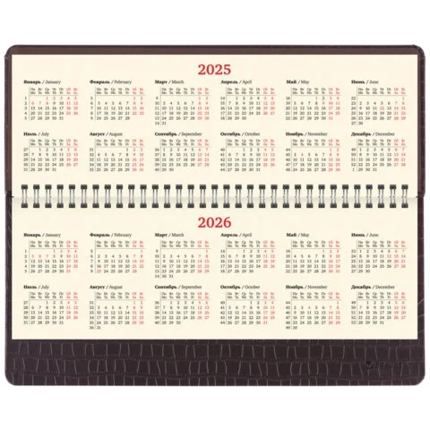Внутренний блок содержит 60 листов офсетной бумаги кремового цвета плотностью 70 г/м2. Обложка из экокожи коричневого цвета и твердый переплет обеспечивают долгий срок службы. Для заметок в планинге имеется 11 страниц в конце внутреннего блока. Подходит для горячего тиснения. Скрепление осуществляется с помощью евроспирали. Размер изделия – 305х140 мм.