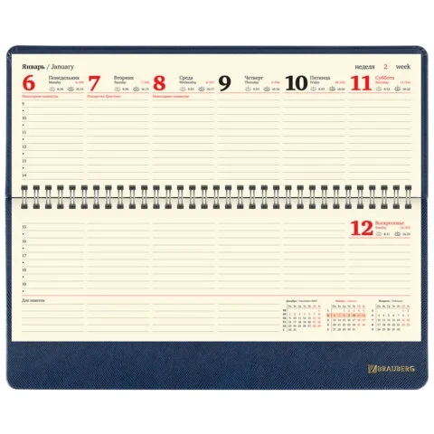 Внутренний блок содержит 60 листов офсетной бумаги кремового цвета плотностью 70 г/м2. Обложка из экокожи и твердый переплет обеспечивают долгий срок службы. Для заметок в планинге имеется 11 страниц в конце внутреннего блока. Подходит для горячего тиснения. Скрепление осуществляется с помощью евроспирали. Размер изделия – 305х140 мм.