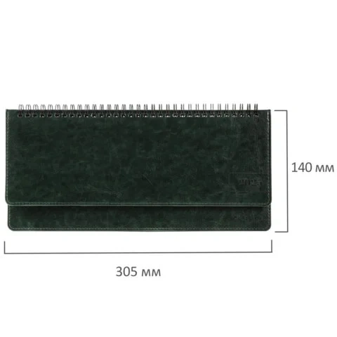 Внутренний блок содержит 60 листов офсетной бумаги кремового цвета плотностью 70 г/м2. Обложка из экокожи и твердый переплет обеспечивают долгий срок службы. Для заметок в планинге имеется 11 страниц в конце внутреннего блока. Подходит для горячего тиснения. Скрепление осуществляется с помощью евроспирали. Размер изделия – 305х140 мм.