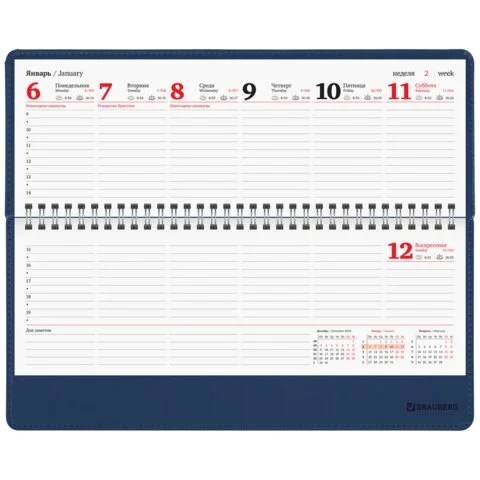 Внутренний блок содержит 60 листов офсетной бумаги белого цвета плотностью 70 г/м2. Обложка из экокожи и твердый переплет обеспечивают долгий срок службы. Для заметок в планинге имеется 11 страниц в конце внутреннего блока. Подходит для горячего тиснения. Скрепление осуществляется с помощью евроспирали. Размер изделия – 305х140 мм.