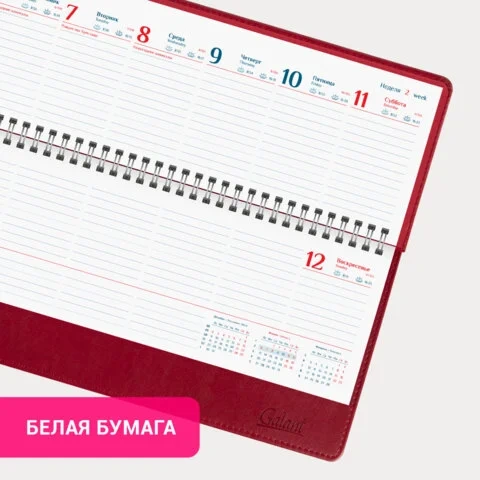 Внутренний блок содержит 60 листов офсетной бумаги белого цвета плотностью 70 г/м2. Обложка из экокожи и твердый переплет обеспечивают долгий срок службы. Для заметок в планинге имеется 11 страниц в конце внутреннего блока. Подходит для горячего тиснения. Скрепление осуществляется с помощью евроспирали. Размер изделия – 305х140 мм.