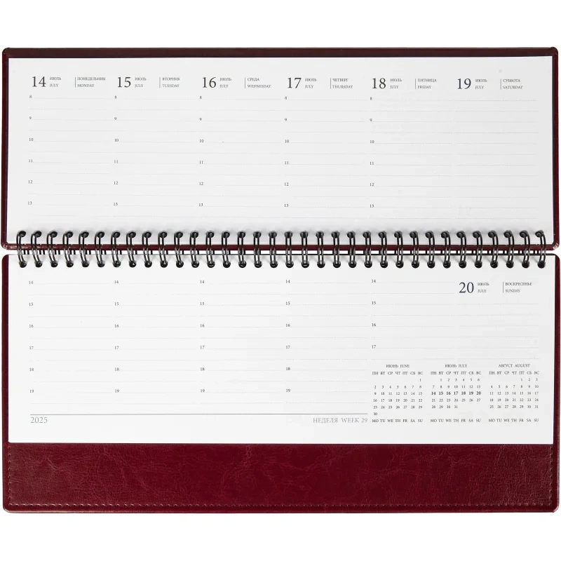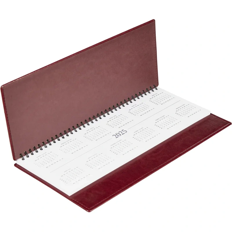 Планинг датированный 2025,бордо, 303х150 мм, 120стр, АТТАСНЕ Agenda Планинг датированный 2025 год, цвет бордовый -303х150 мм, 120 стр., блок в 2 краски, календарь на 2025 год. Обложка из высококачественного переплетного материала бордового цвета, имитирующего натуральную кожу. Возможно нанесение логотипа на обложку любым способом тиснения. Блок: офсет 70 г/м2 (линейка). Содержит информационно-справочный блок - планы на год, блок для заметок.