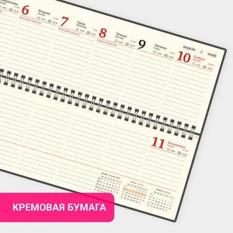 Внутренний блок содержит 60 листов офсетной бумаги кремового цвета плотностью 70 г/м2. Обложка из экокожи и твердый переплет обеспечивают долгий срок службы. Для заметок в планинге имеется 11 страниц в конце внутреннего блока. Подходит для горячего тиснения. Скрепление осуществляется с помощью евроспирали. Размер изделия – 305х140 мм.