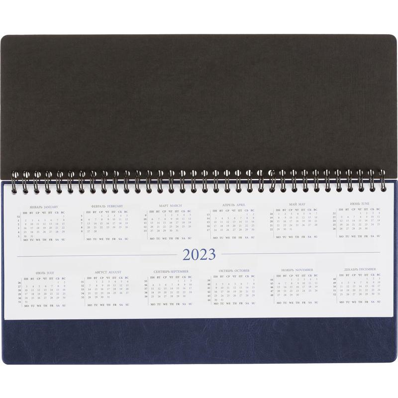 Планинг датированный 2023 год, 303?150 мм. Однотонная обложка из высококачественного переплетного материала синего цвета, имитирующего натуральную кожу. Гладкая фактура с легким блеском. Возможно нанесение логотипа на обложку, любым способом тиснения. Блок: 60 листов (120 страниц), блок в две краски, офсет 70 г/кв.м (линейка). Информационный блок: календарь на 2023 год, годовой план, в конце блок для заметок.