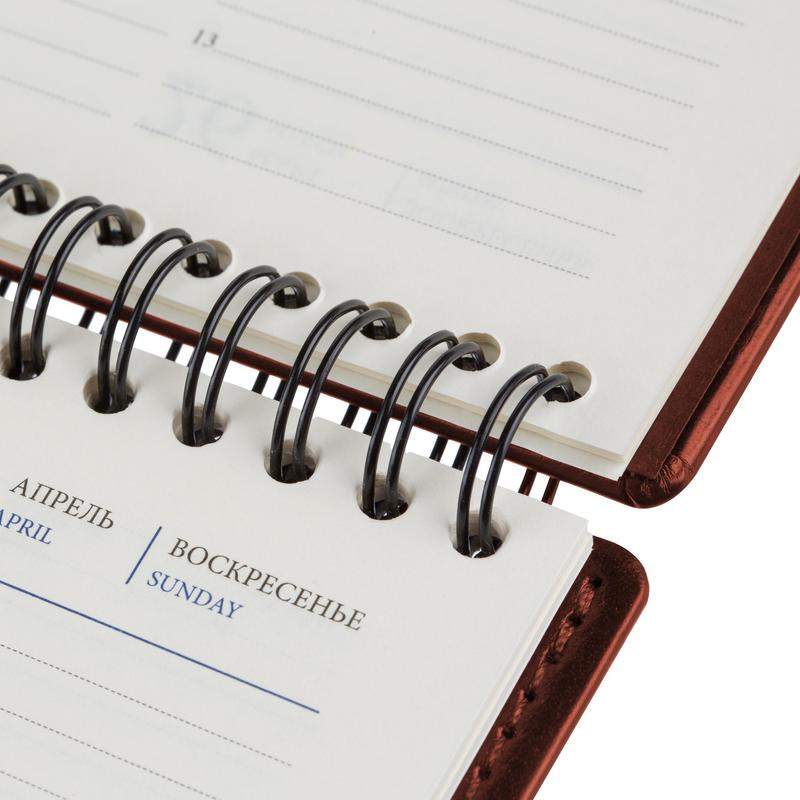 Планинг датированный 2023 год, 303?150 мм. Однотонная обложка из высококачественного переплетного материала коричневого цвета, имитирующего натуральную кожу. Гладкая фактура с легким блеском. Прошивка по периметру. Возможно нанесение логотипа на обложку, любым способом тиснения. Блок: 60 листов (120 страниц), блок в две краски, офсет 70 г/кв.м (линейка). Информационный блок: календарь на 2023 год, годовой план, в конце блок для заметок.