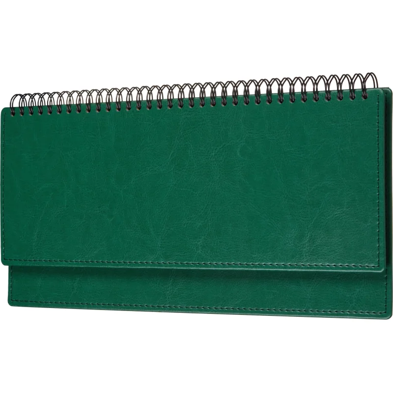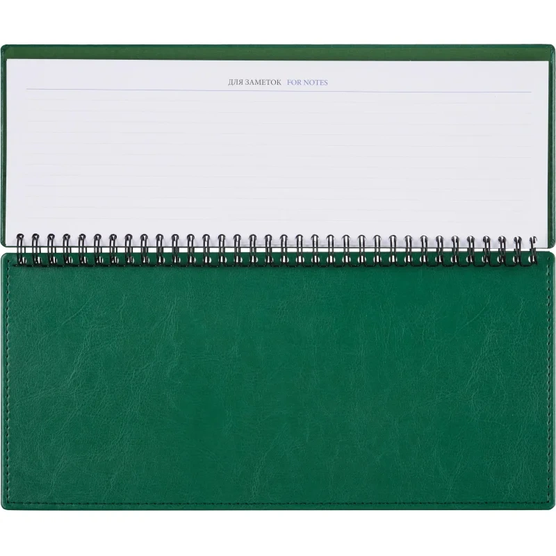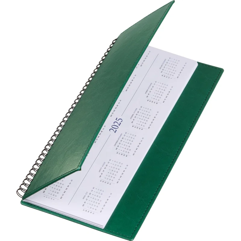 Планинг датированный 2025 год, цвет зеленый -303х150 мм, 120 страниц, блок в 2 краски, календарь на 2025 год. Обложка из высококачественного переплетного материала зеленого цвета, имитирующего натуральную кожу. Возможно нанесение логотипа на обложку любым способом тиснения. Блок: офсет 70 г/кв.м (линейка). Содержит информационно-справочный блок - планы на год; блок для заметок.