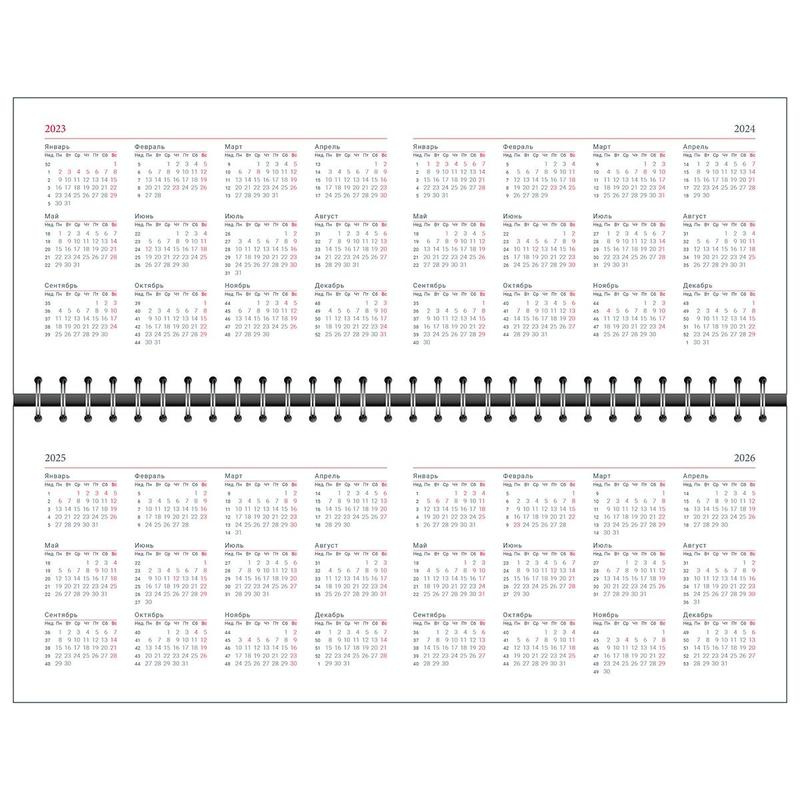 Датированный внутренний блок в линейку на 64 листа (128 страниц) — из высококачественной бумаги 100% белизны и плотностью 70 г/м2 с прямыми уголками. Информационный блок планинга включает в себя: личные данные, календари на2023—2026 гг. , разворот «планирование и важные даты».