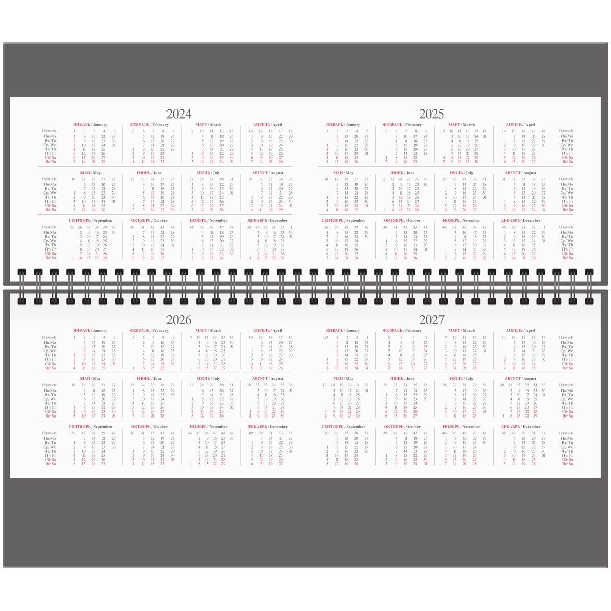 Планинг датированный формата 330*130 мм из коллекции «Ariane». Обложка изготовлена из высококачественного переплетного материала с поролоновой прослойкой, цвет обложки - бордовый. Внутренний блок состоит из 64 листов офсетной бумаги плотностью 70 г/м2, печать блока в 2 краски, календарь на 4 года, телефонная книжка.