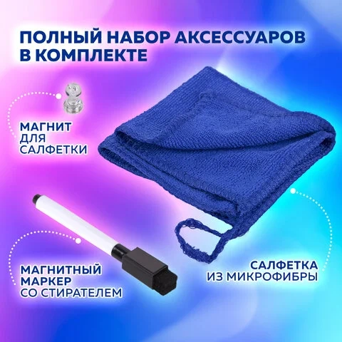 В комплекте: черный маркер для белых досок с магнитом и стирателем в колпачке, салфетка из микрофибры (с 'ушком' для подвешивания) и магнит специальной формы, удобной для подвешивания салфетки. Во избежание преждевременного высыхания маркер рекомендуется хранить на холодильнике, колпачком вниз.