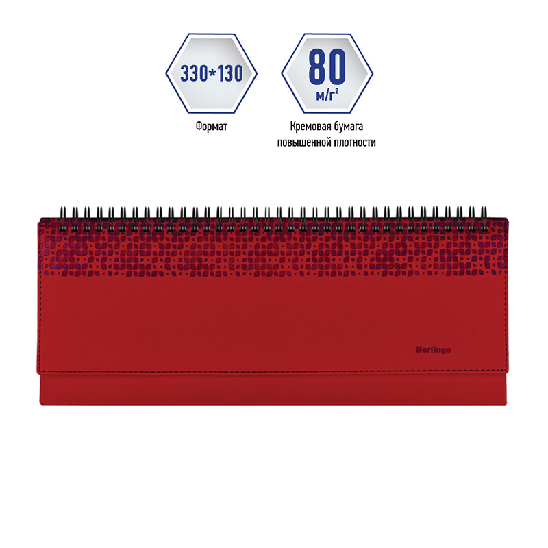 Планинги Berlingo Vivella Prestige изготовлены из высококачественного кожзаменителя с мягкой гладкой матовой поверхностью. Планинг недатированный формата - 330*130 мм с обложкой с поролоновой прослойкой, прострочкой по периметру и имиджевым тиснением. Цвет обложки - красный. Высококачественная белая бумага повышенной плотности 80 г/м2, пантонная печать блока в 2 краски.