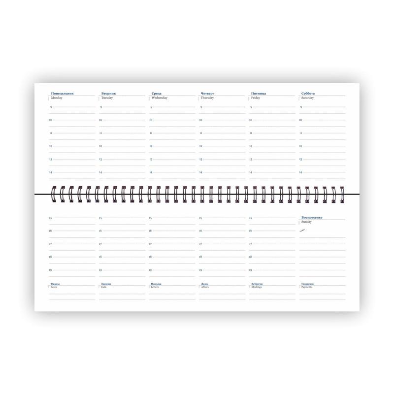 Планинг недатированный, 303?150 мм. Однотонная обложка из высококачественного переплетного материала коричневого цвета. Гладкая фактура с легким блеском. Возможно нанесение логотипа на обложку любым способом тиснения. Блок: офсет плотностью 70 г/кв.м, 120 страниц, блок в две краски, крепление на спирали.