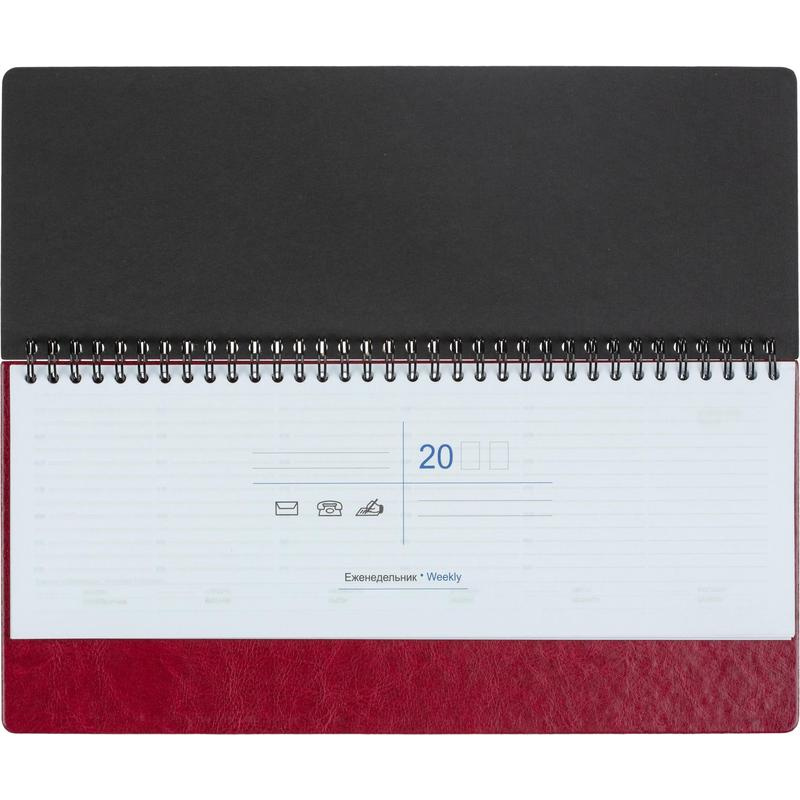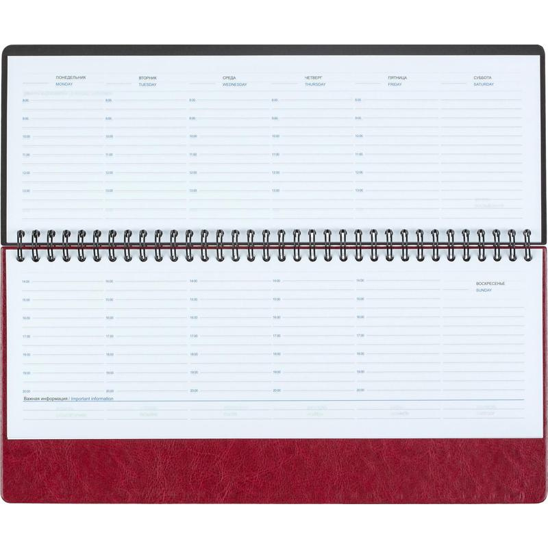 Планинг недатированный, 303?150 мм. Однотонная обложка из высококачественного переплетного материала бордового цвета. Гладкая фактура с легким блеском. Возможно нанесение логотипа на обложку любым способом тиснения. Блок: офсет 70 г/кв.м (линейка), количество листов 60, блок в две краски, крепление на спирали.