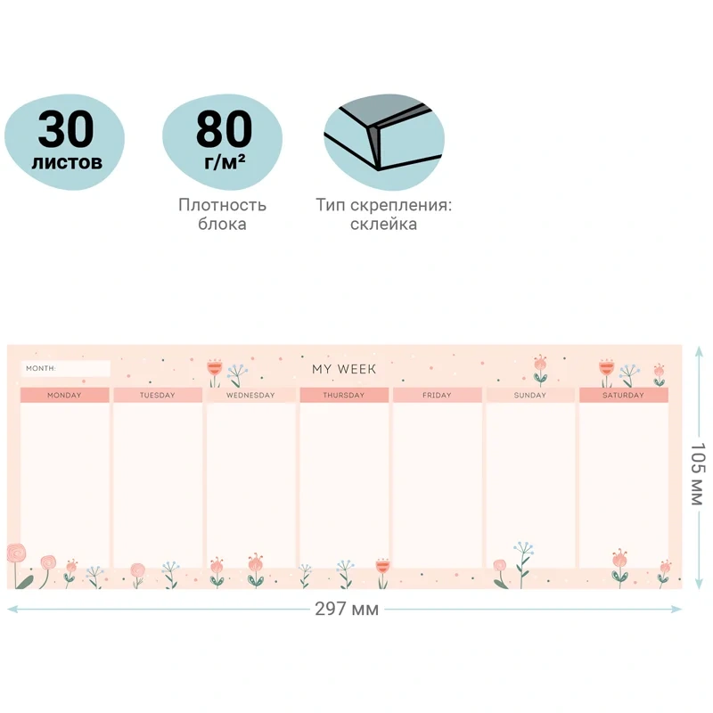 Планер на неделю на склейке MESHU Meadow поможет стильно и удобно фиксировать важные дела и задачи. Плотность офсетной бумаги составляет 80 г/м2. Размер недатированного планера – 297?105 мм, 30 листов в блоке.