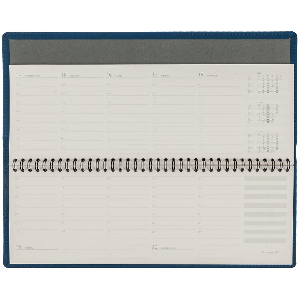Материал обложки — Soft Touch, синий НН. Блок 941: датирован на 2021 год. Кол-во страниц — 128; Бумага — тонированная, плотность 70 г/м; Закрытая пружина. Размер: 33,5х13 см Материал: покрытие софт-тач Цвет: синий