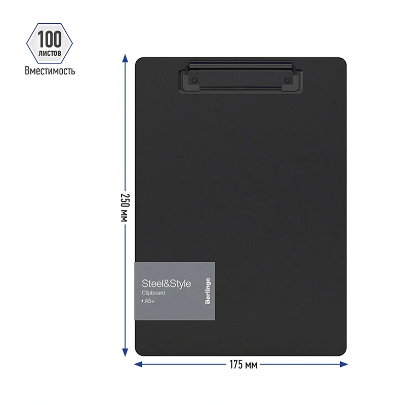 Прочный стильный планшет с зажимом Berlingo серии Steel&Style формата А5+ позволяет удобно делать записи на весу. Планшет изготовлен из полифома толщиной 2500 мкм. Вмещает 100 листов. Планшет имеет насыщенный белый цвет оборотной стороны в сочетании с фактурой 'сталь' и чёрный цвет внутренней поверхности с чёрным прижимом. Металлический зажим надёжно фиксирует документы, не повреждая их. Размер планшета с зажимом - 250*175 мм. Упакован в индивидуальный пакет с липким краем.