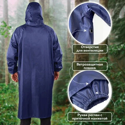 Ветрозащитная планка, рукав реглан с приточной манжетой. В нижней части пройм расположены два вентиляционных отверстия, оформленные люверсами. Низ изделия обработан в подгиб. Внешний край капюшона собран на кулису, в которую вставлен шнур с наконечниками и фиксаторами. Ткань таффета из полиэстера обладает хорошими ветрозащитными и влагозащитными свойствами, не промокает и не растягивается при намокании, устойчива к ультрафиолетовому излучению.