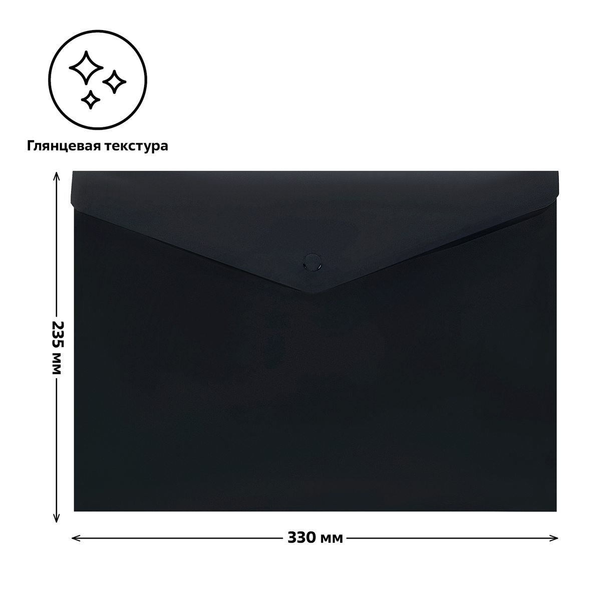 Папка-конверт на кнопке «СТАММ» формата А4 изготовлена из качественного полипропилена толщиной 150мкм. Размер изделия составляет 330*235мм, ориентация – горизонтальная. Предназначена для хранения и транспортировки бумаг. Папка плотно закрывается клапаном с кнопкой, и надёжно защищает документы от влаги и пыли. Имеет глянцевую текстуру. Вместимость – до 100 листов. Цвет изделия – чёрный.