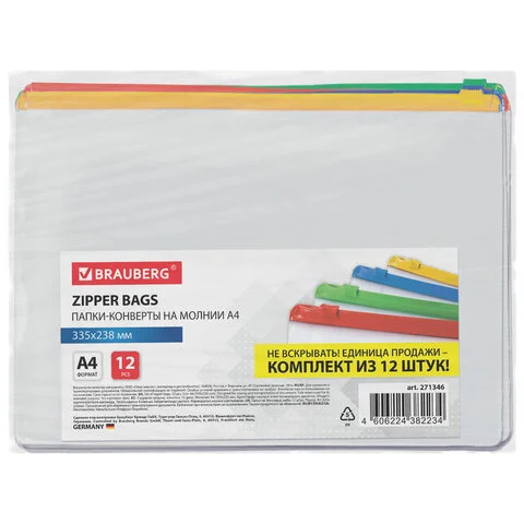 Пластиковая папка на молнии Brauberg Супер Комплект А4, А4, 12шт