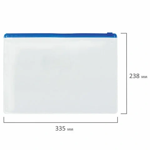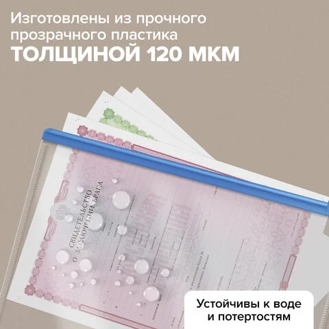 Папки-конверты изготовлены из прозрачного пластика толщиной 0,12 мм с гладкой фактурой. Формат А4 (335х238 мм). Герметичная застежка-зиплок защищает документы от механических повреждений, а также пыли и влаги. Цвет молнии - ассорти (3 синих, 3 красных, 3 желтых, 3 зеленых).